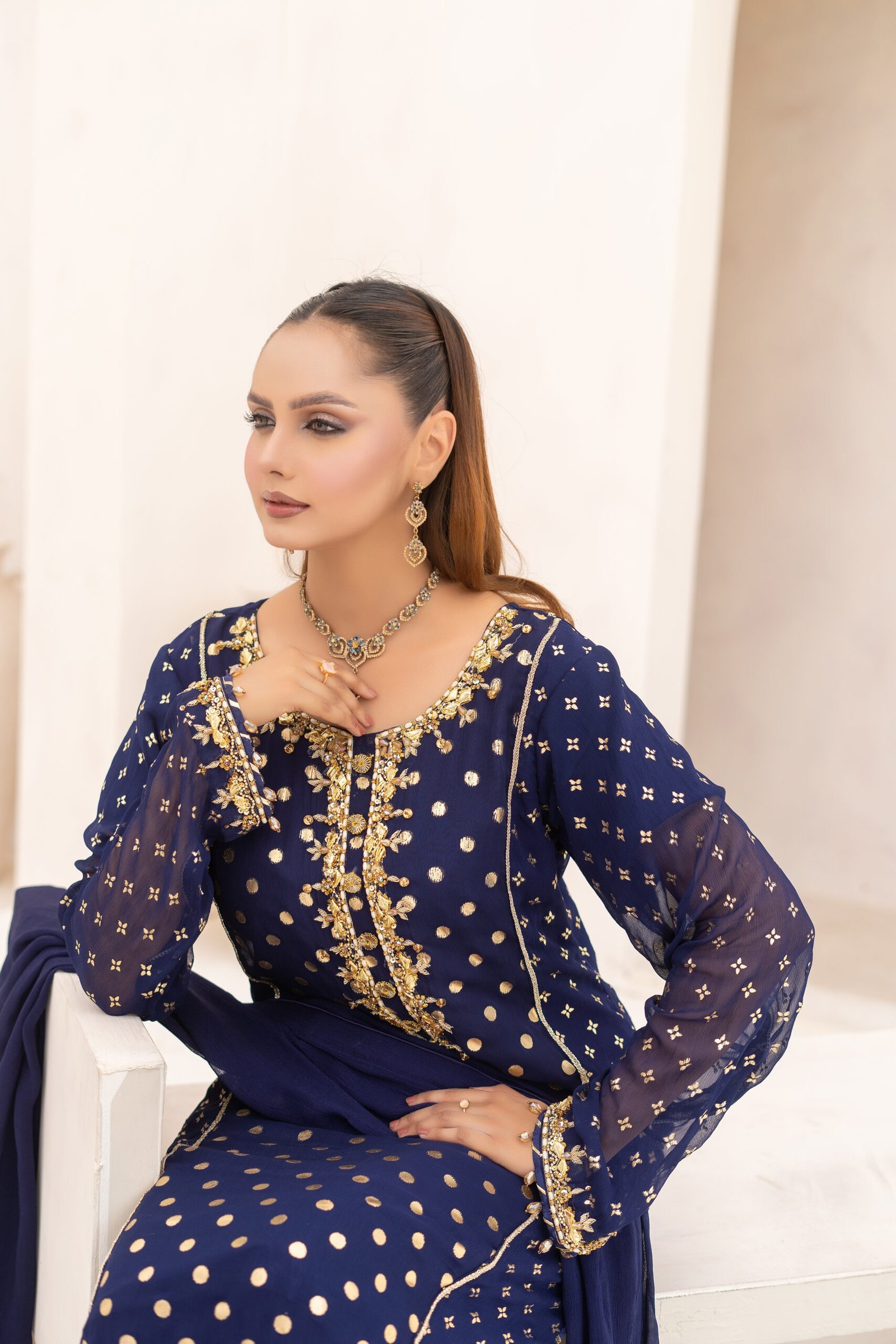 This elegant deep blue 3-piece outfit features a premium chiffon shirt and dupatta with modern polka dot foil printing, paired with soft silk/crepe trousers for a comfortable yet refined fit. The neckline and sleeves are beautifully adorned with intricate kora, nug, beads, zari, gota, and sequence work, adding a luxurious touch. Finished with gold embellishments, this ensemble offers a graceful, timeless look perfect for festive and formal occasions.