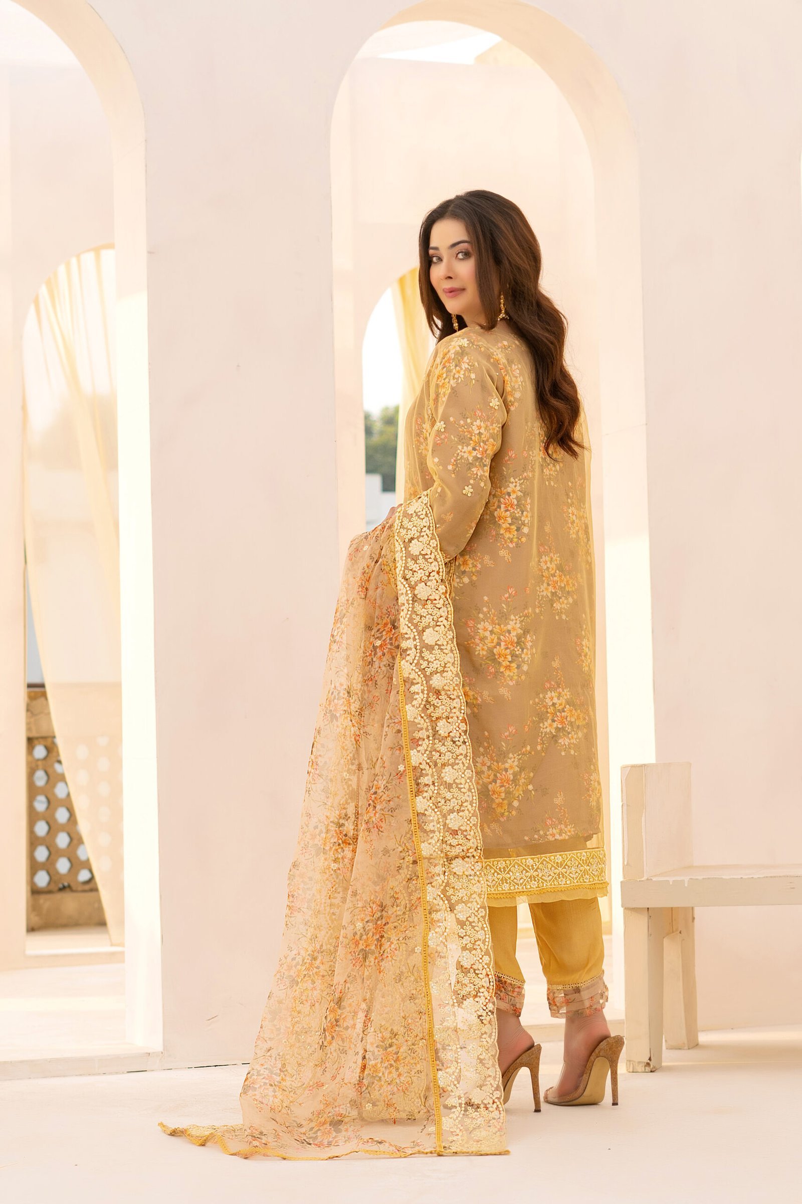 ⦁ Organza dupatta enhanced with floral print and embroidered lace borders for a cohesive, luxurious look.