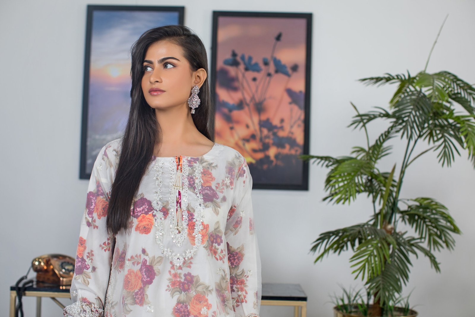 ⦁ Digital floral inner adds contrast with its vibrant tones against the soft, neutral base
