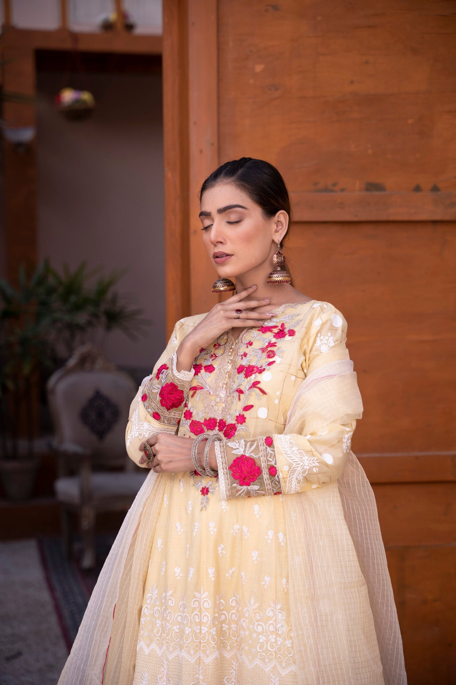 A vibrant yellow embroidered frock paired with a printed trouser and an elegant organza dupatta perfect for festive days, cultural events, and stylish casual wear with its blend of comfort, charm, and sophistication.