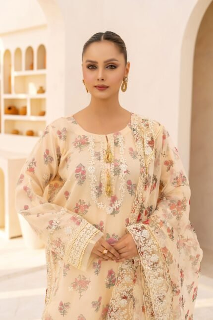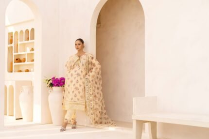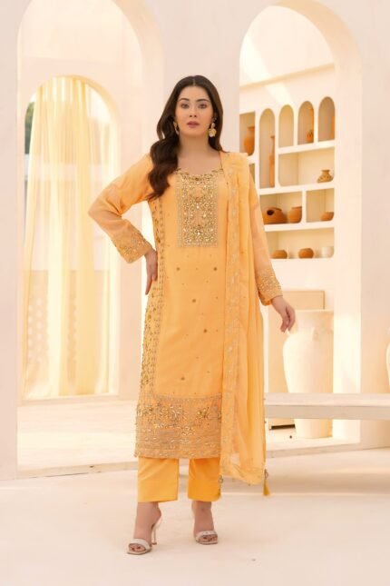 Experience timeless elegance with this premium chiffon 3-piece ensemble, featuring delicate foil printing, detailed handwork, and a beautifully embroidered neckline. Paired with a matching chiffon dupatta and a comfortable straight shalwar, this outfit blends luxury, comfort, and festive charm—perfect for weddings and special occasions.