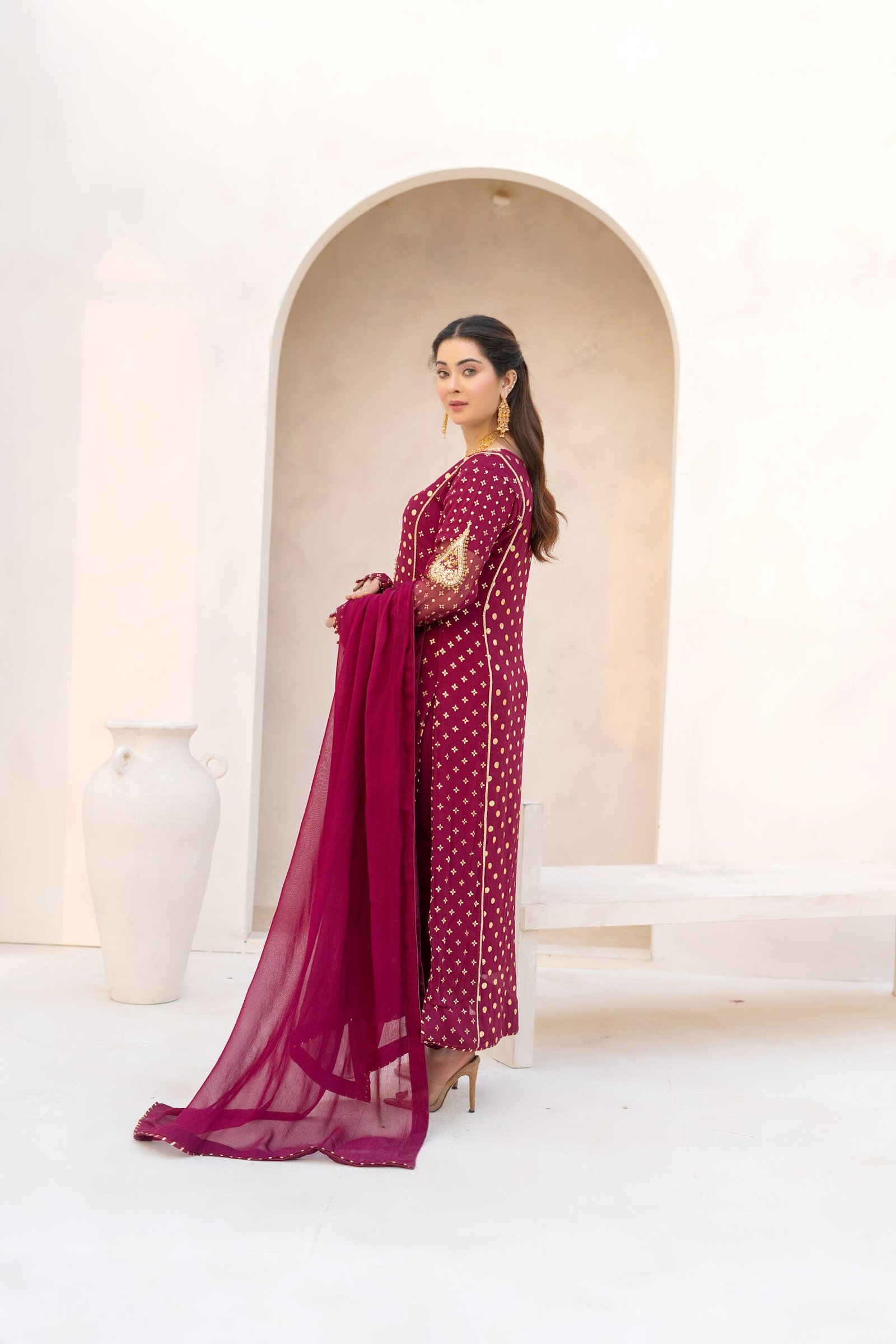 ⦁ Dupatta can be draped traditionally over both shoulders or styled on one side for a modern touch
