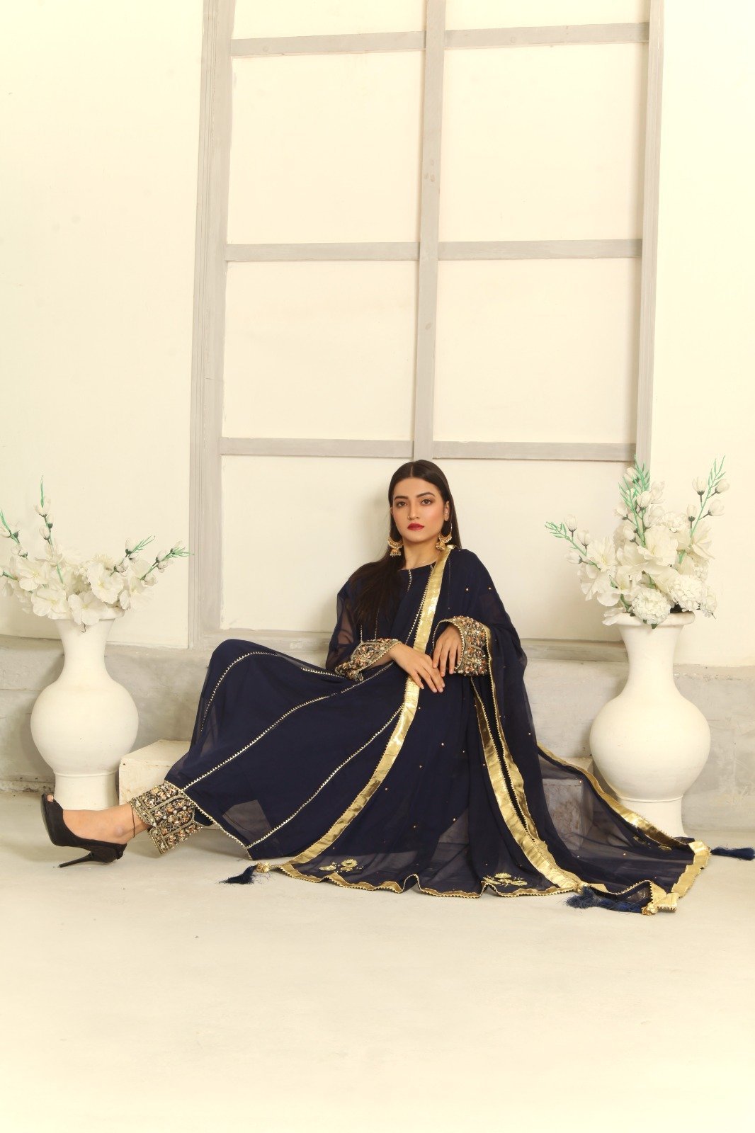 – This 3-piece Navy Blue chiffon shalwar kameez combines traditional craftsmanship with modern sophistication, making it a versatile and timeless addition to your wardrobe.