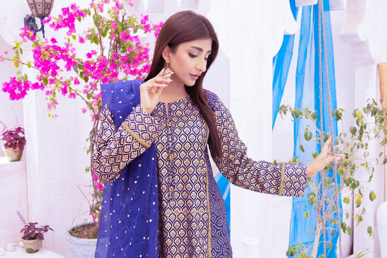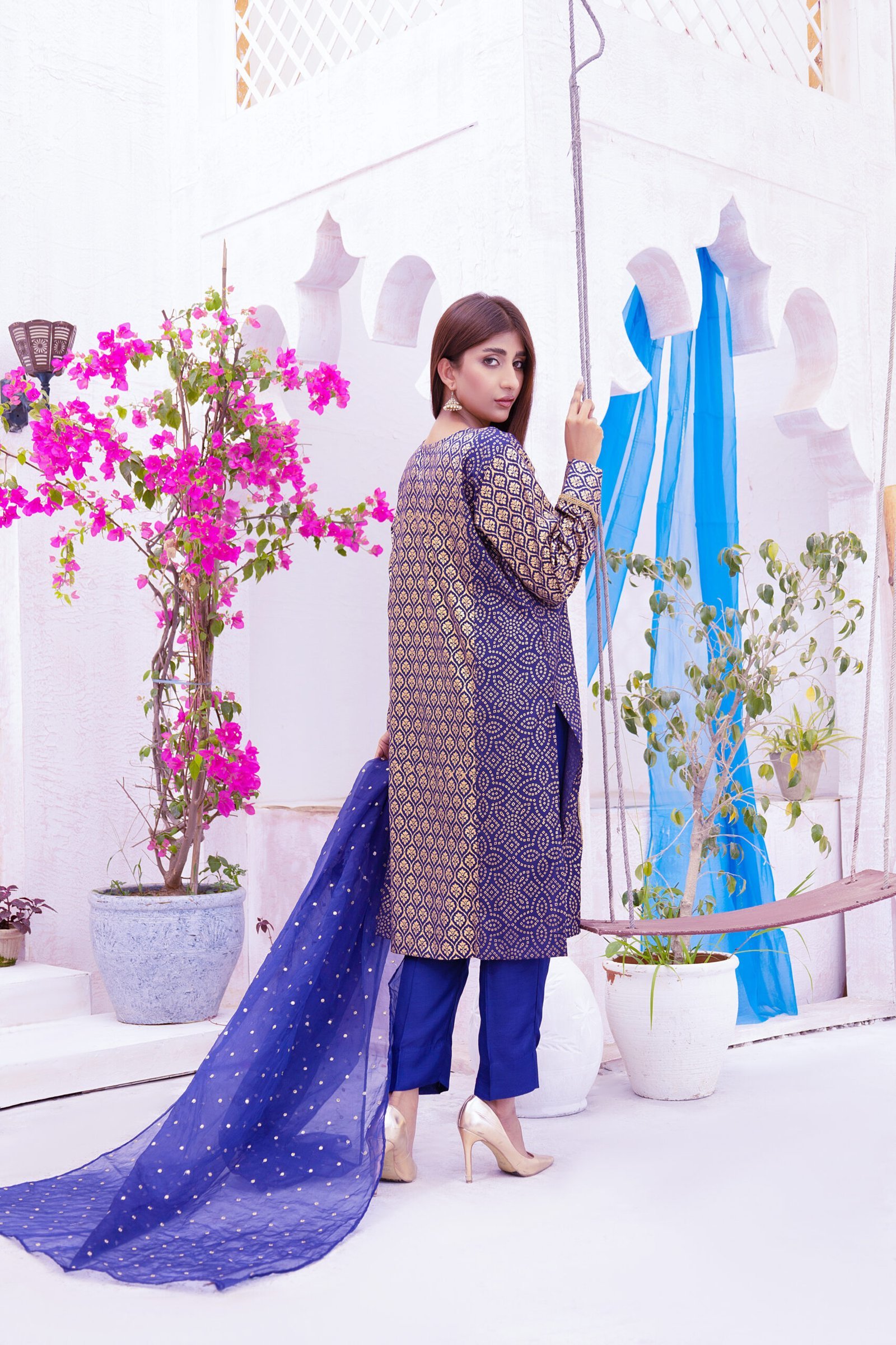 Step into elegance with this 3-piece sapphire blue ensemble featuring a Kattan Silk shirt with gold prints, Zari, Naqshi, and bead detailing, a lightweight Organza dupatta with Sitara embellishments, and a matching tailored trouser. Designed with a slim fit, this sophisticated set is perfect for festive occasions and grand celebrations.