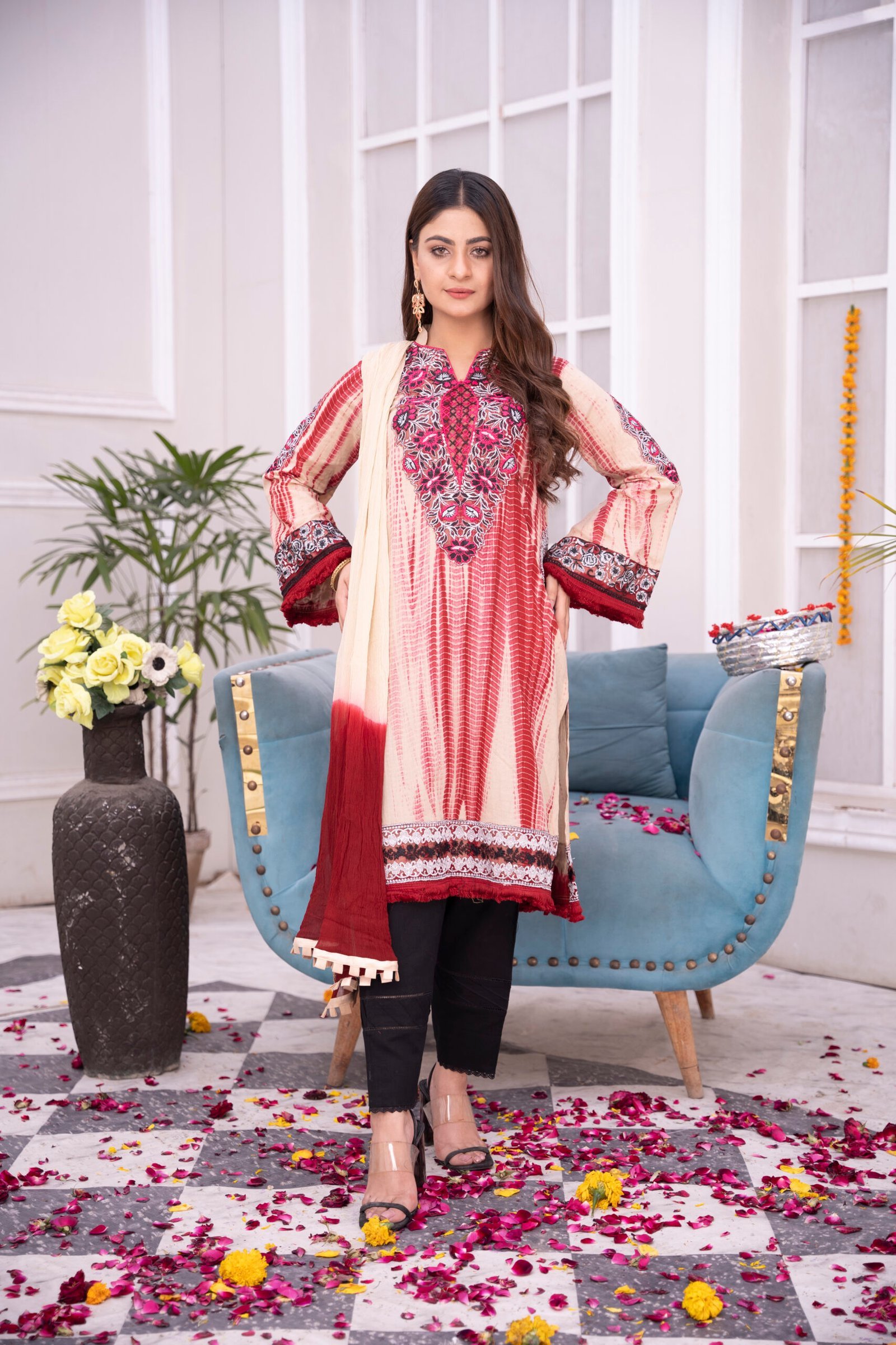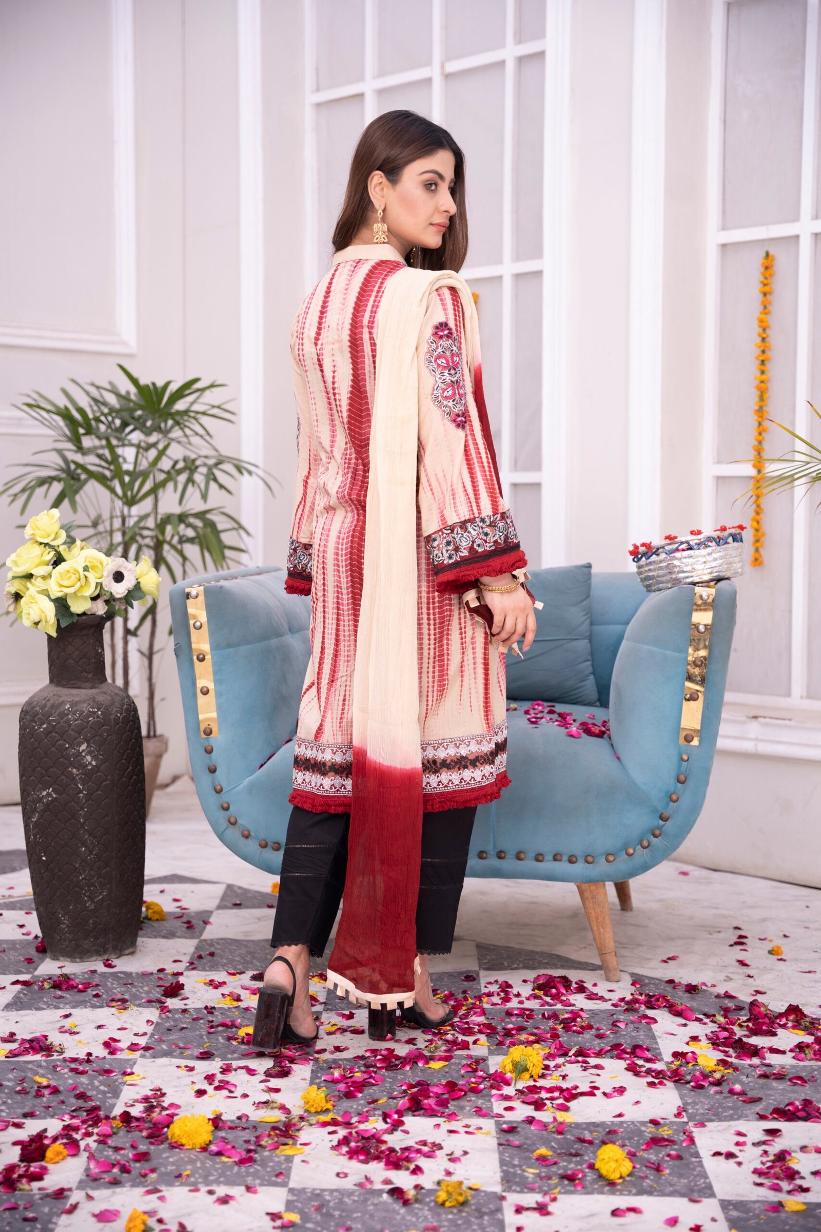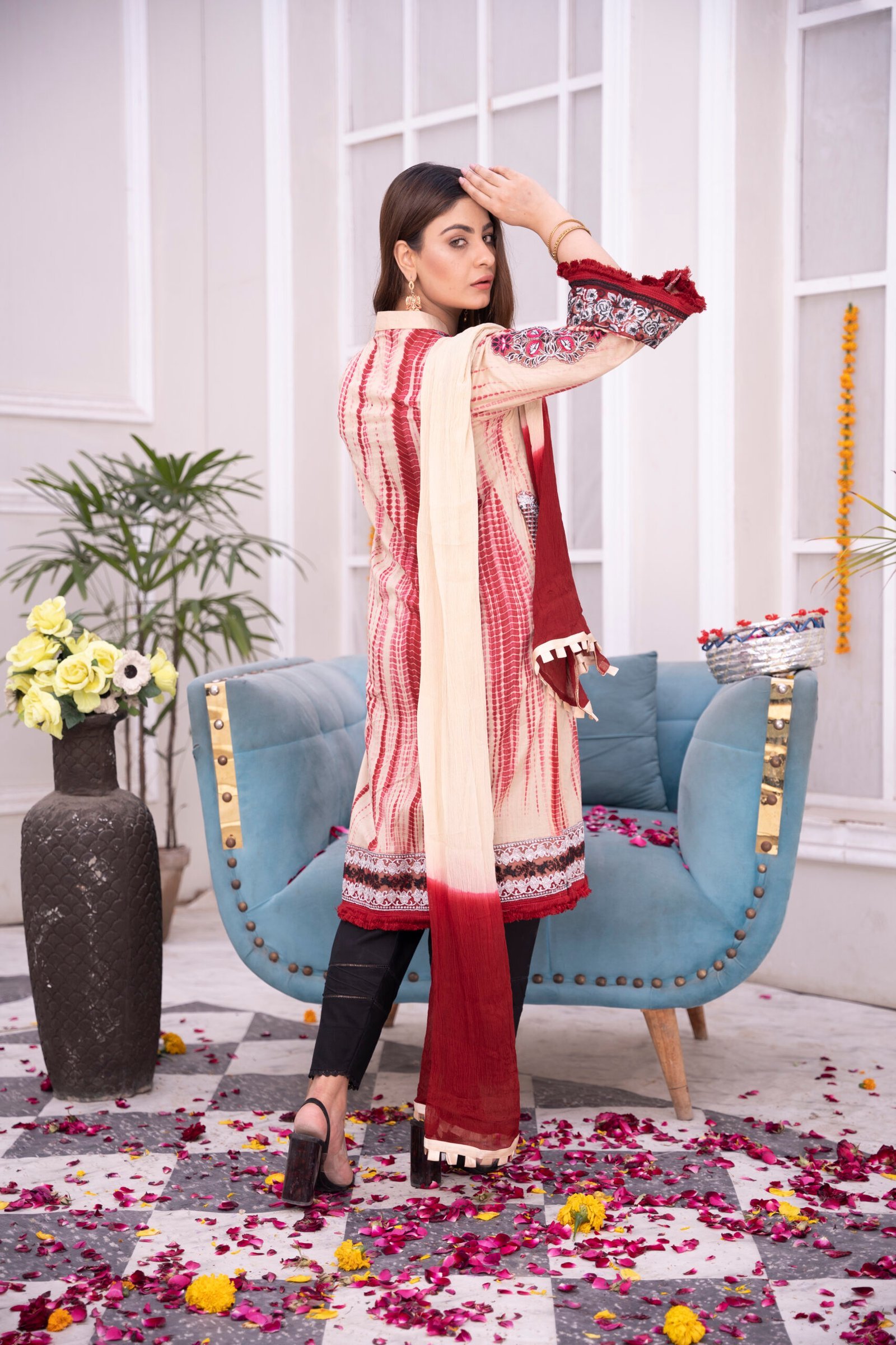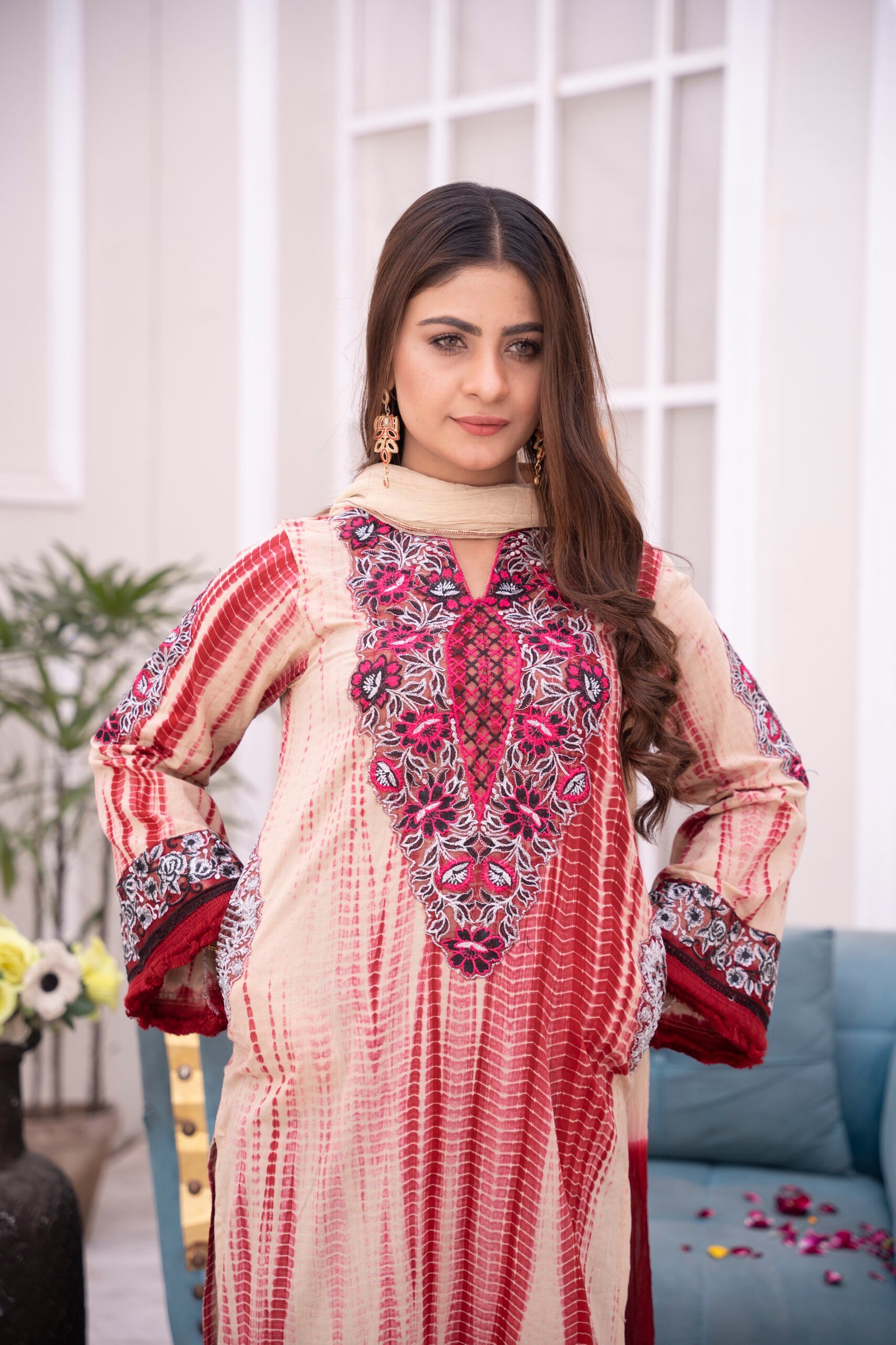 This stylish purple tie-and-dye three-piece outfit features an elegant lawn shirt, a comfortable cambric trouser, and a flowing chiffon dupatta. Enhanced with delicate embroidery and crafted from premium fabrics, it offers a trendy yet graceful look suitable for festive events, cultural gatherings, and everyday wear.