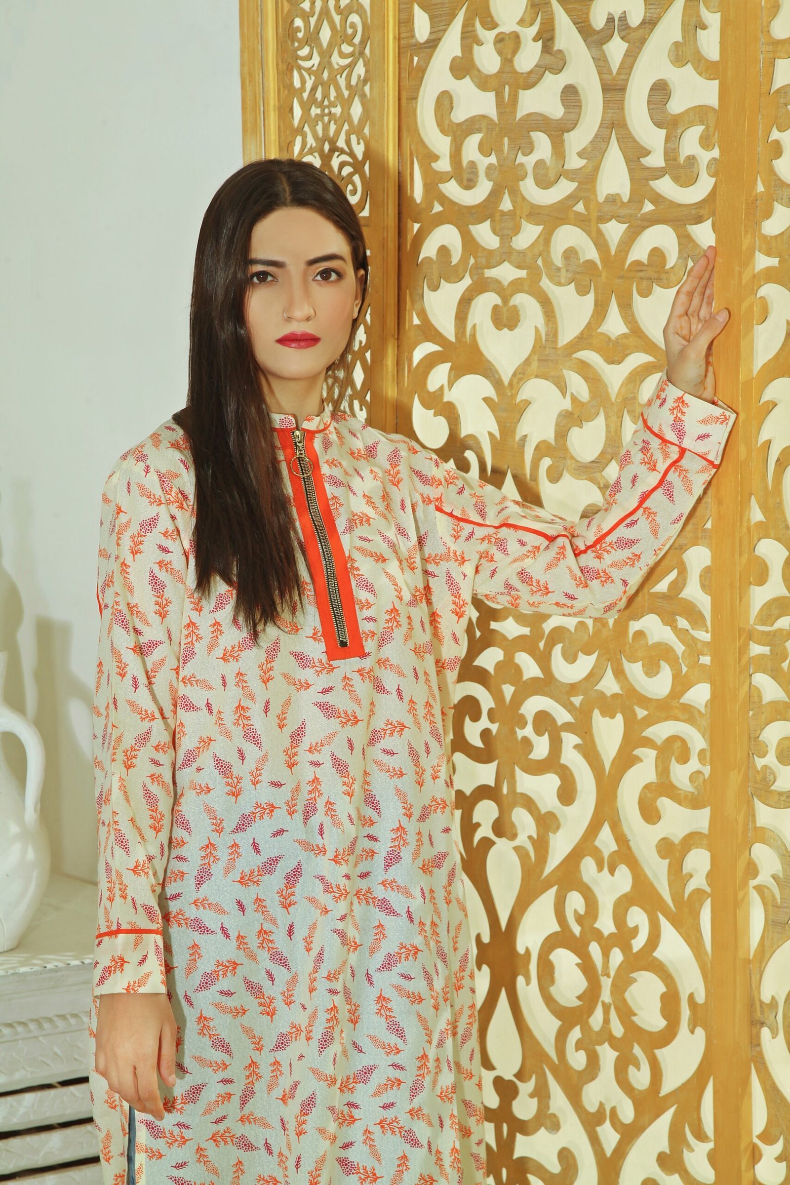 A chic beige Karrandi lawn shirt featuring bold orange leaf prints, a stylish zipper placket, printed cuffs, and a relaxed rounded hem perfect for adding freshness and vibrancy to your winter wardrobe.