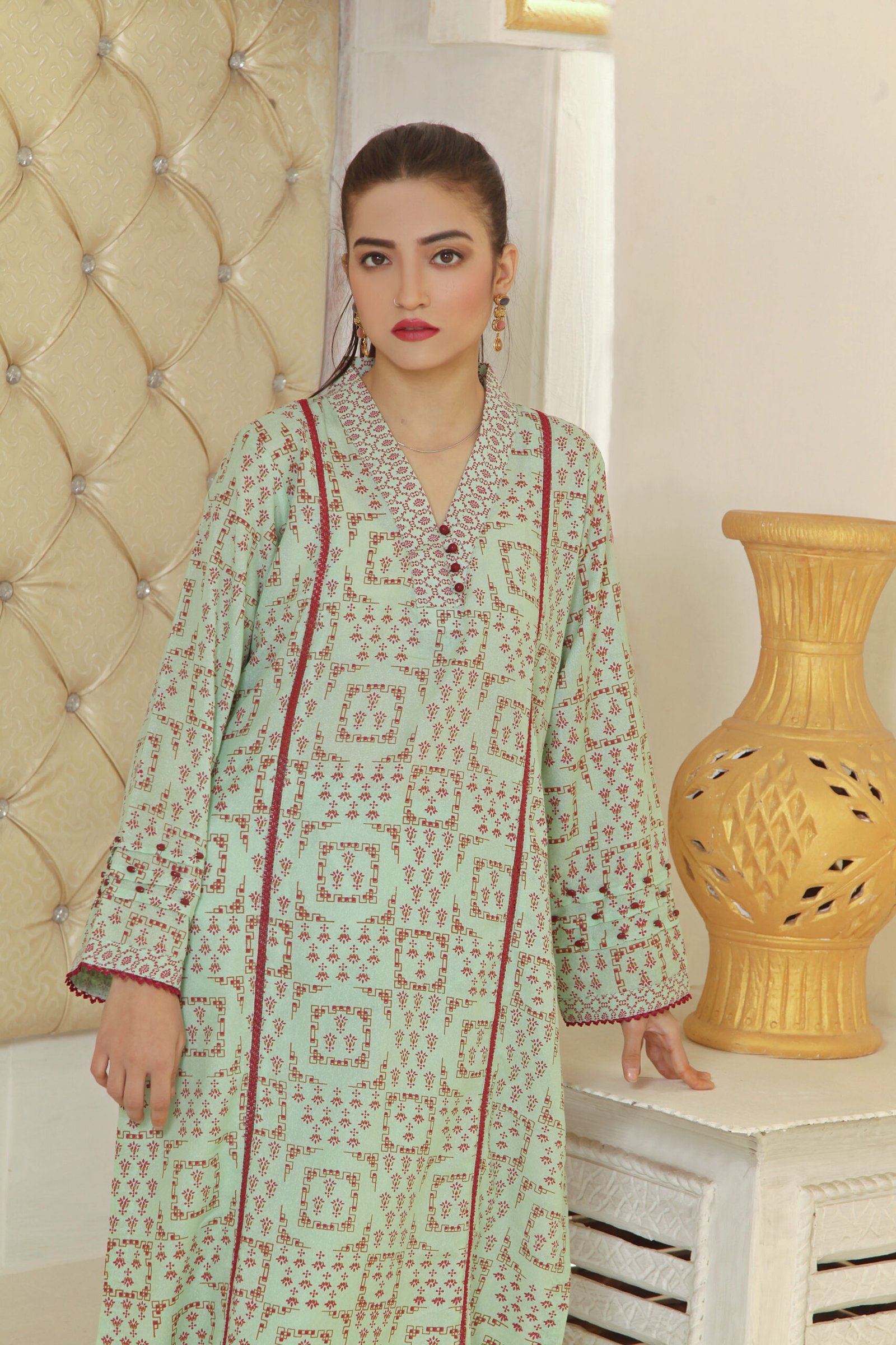 A soft pistachio green Karrandi lawn shirt featuring maroon block prints, delicate beadwork, and elegant GPO lace perfect for transitional seasons with its warm yet breathable comfort and refined, stylish detailing.