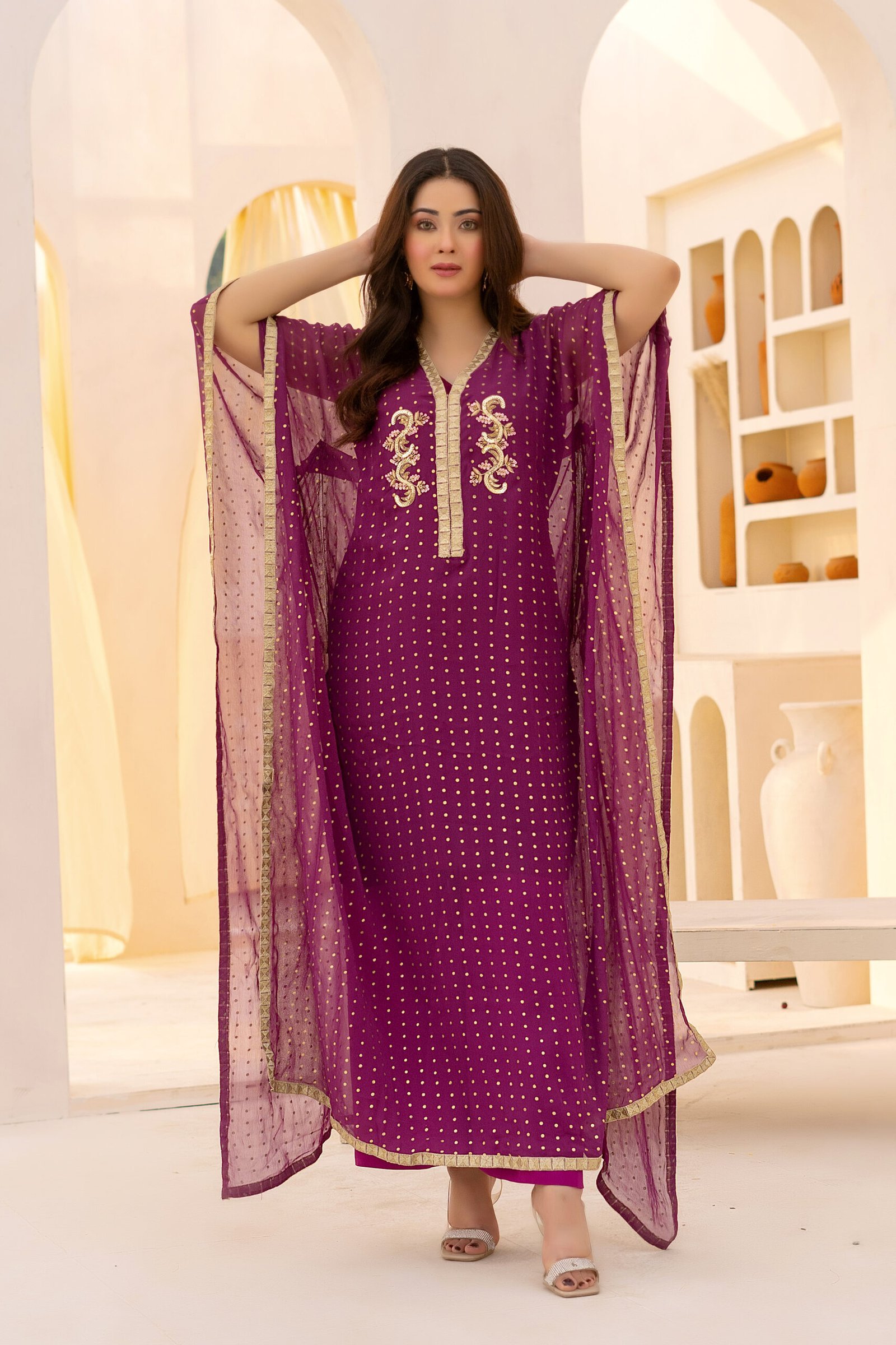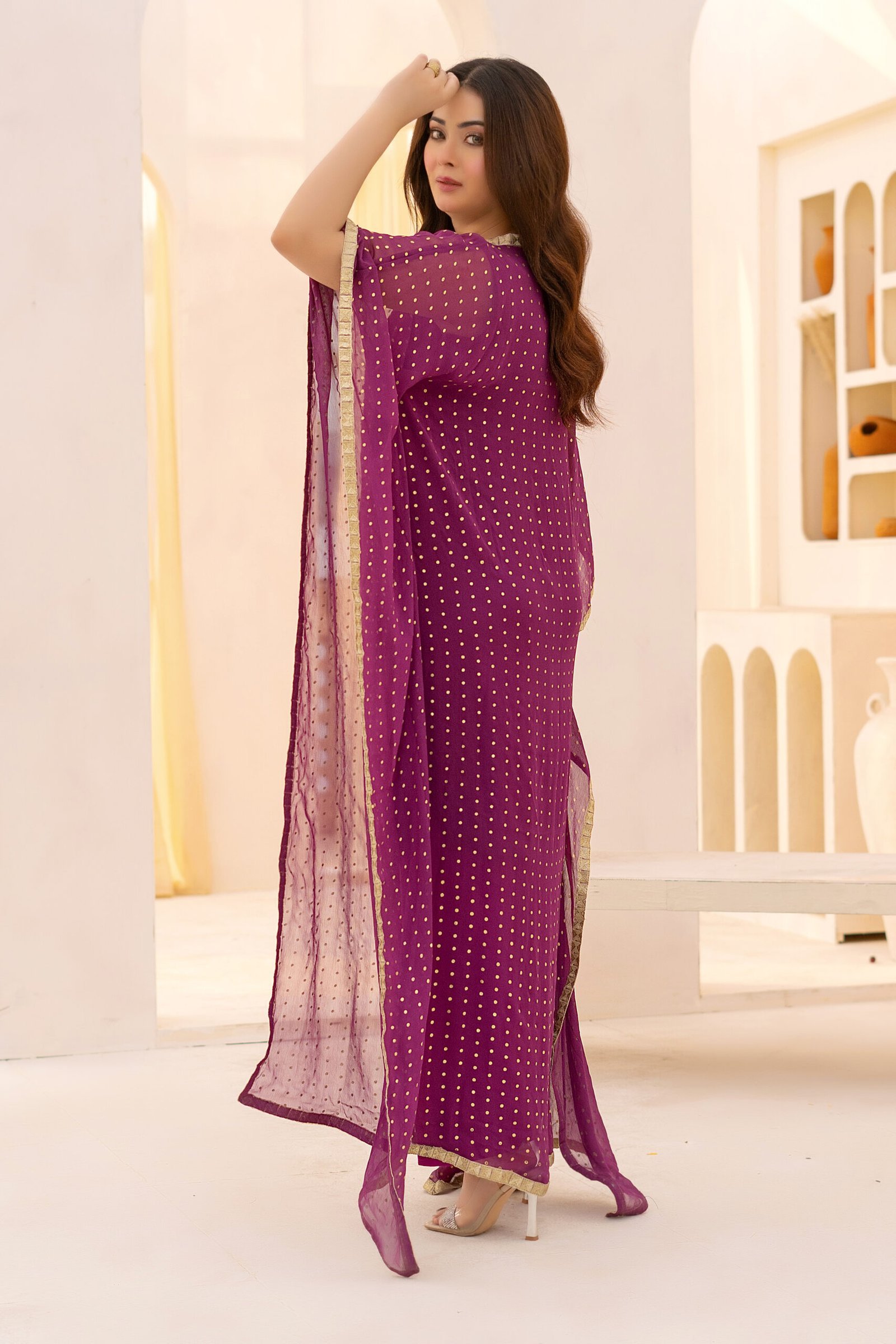 PURPLE FOIL PRINTED CHIFFON KAFTAN