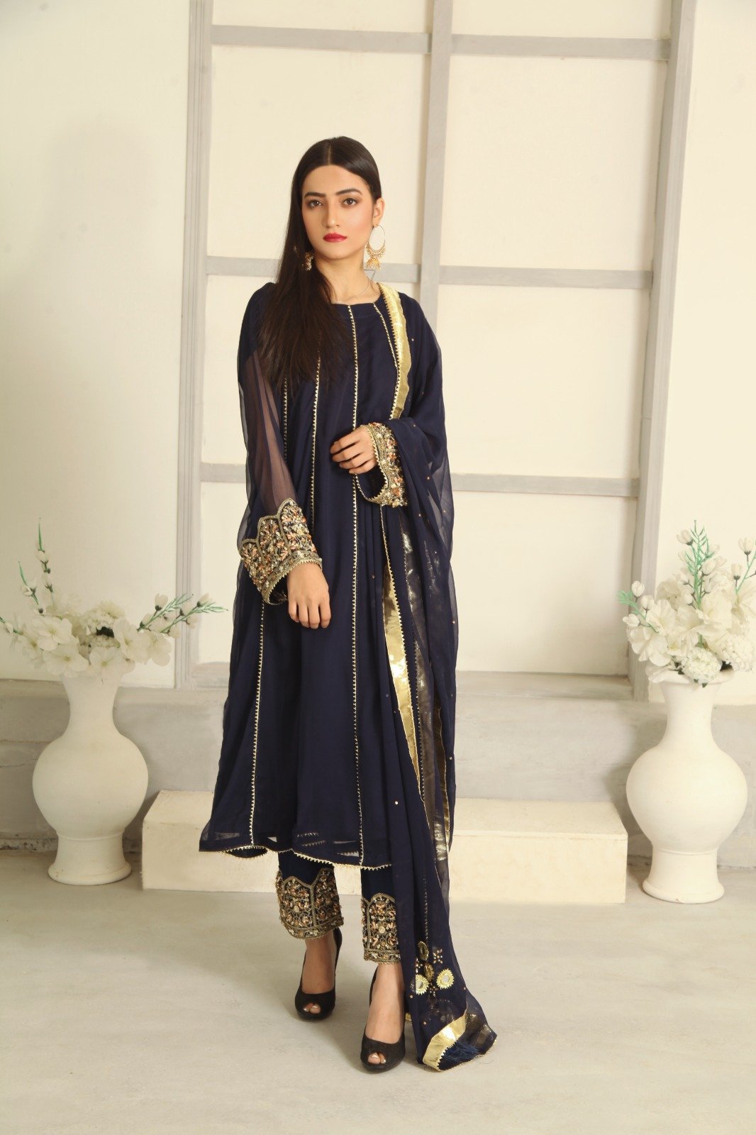 – This 3-piece Navy Blue chiffon shalwar kameez combines traditional craftsmanship with modern sophistication, making it a versatile and timeless addition to your wardrobe.
