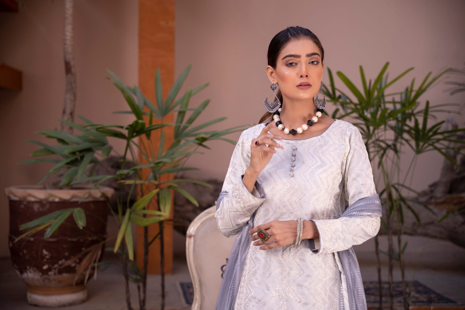 ⦁ The off-white silver shade, paired with detailed embroidery, blends classic charm with modern design, making it a timeless and versatile choice.